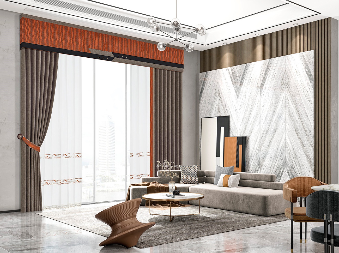 奢雅視感的窗簾,配合簾頭干凈流暢的線條、簡約而不簡單的造型,帶來視覺上的舒適平整,展現出時尚審美與經濟需求結合的奢雅設計。高級配色濃烈醇厚,如一場華麗的探戈,輕而易舉演繹出時尚、現代、摩登的生活空間。